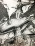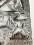 アリスは、あんまり大きなきのこなので調べてみようと、後ろにまわってつっついてみたり、かさのしたからのぞきこんだりしました。「だれだい、きみは」かさの上に、水煙管をくわえらイモムシ君がいました。The mushroom was so large that Alice decided to have a good look. She walked behind the mushroom and poked it, then looked under it. “Why are you ?” asked the Caterpillar, who sat on the mushroom, smoking a hookah.